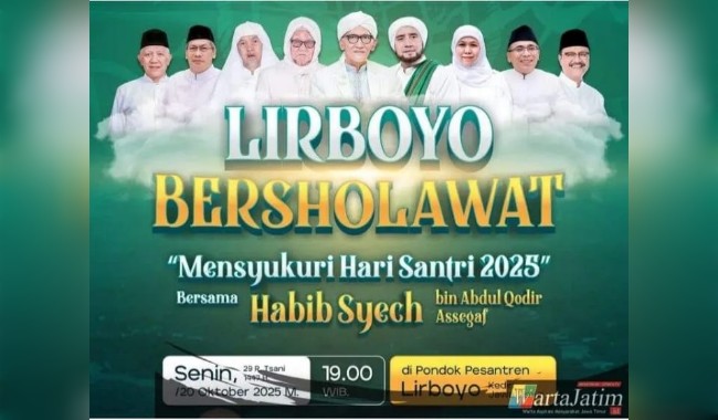 Kediri kota | Hukumkriminal.com – Ribuan jamaah diperkirakan akan memadati acara Lirboyo Bershalawat yang digelar pada Senin malam (20/10/2025) di Lapangan Barat Aula Muktamar Pondok Pesantren Lirboyo, Kota Kediri. Kegiatan yang dimulai pukul 19.00 WIB ini menghadirkan ulama dan habaib serta sejumlah tokoh masyarakat.