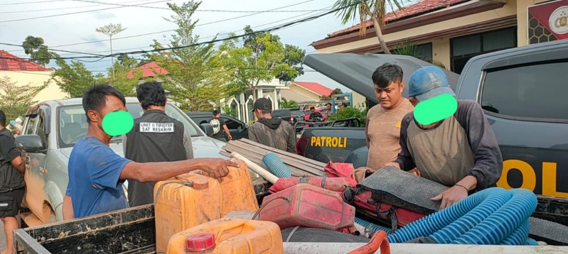 Dalam penggerebekan tersebut, beberapa barang bukti turut diamankan, antara lain satu mesin Robin, satu lembar karpet, satu buah spiral, satu set alat sebuh, dan satu jerigen kosong.
