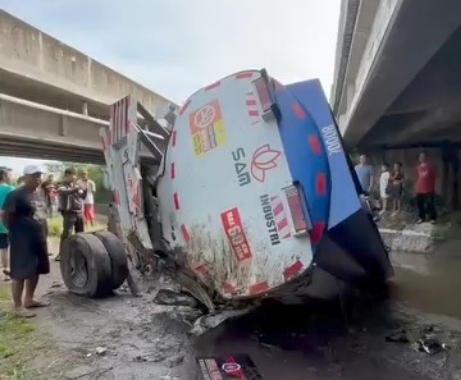 Mojokerto | Sebuah Truk tengki biru putih bernopol L 8273 NH mengalami Kecelakaan maut, tunggal dan terjun dari jalan Tol Jombang – Mojokerto ke sungai yang berlokasi di Dusun Banci, Desa Kamantren, Gedeg, Mojokerto, Jawa Timur muatan, 8.000 liter BBM solar tumpah ke jalan dan sungai, dan sopir truk mengalami luka berat.